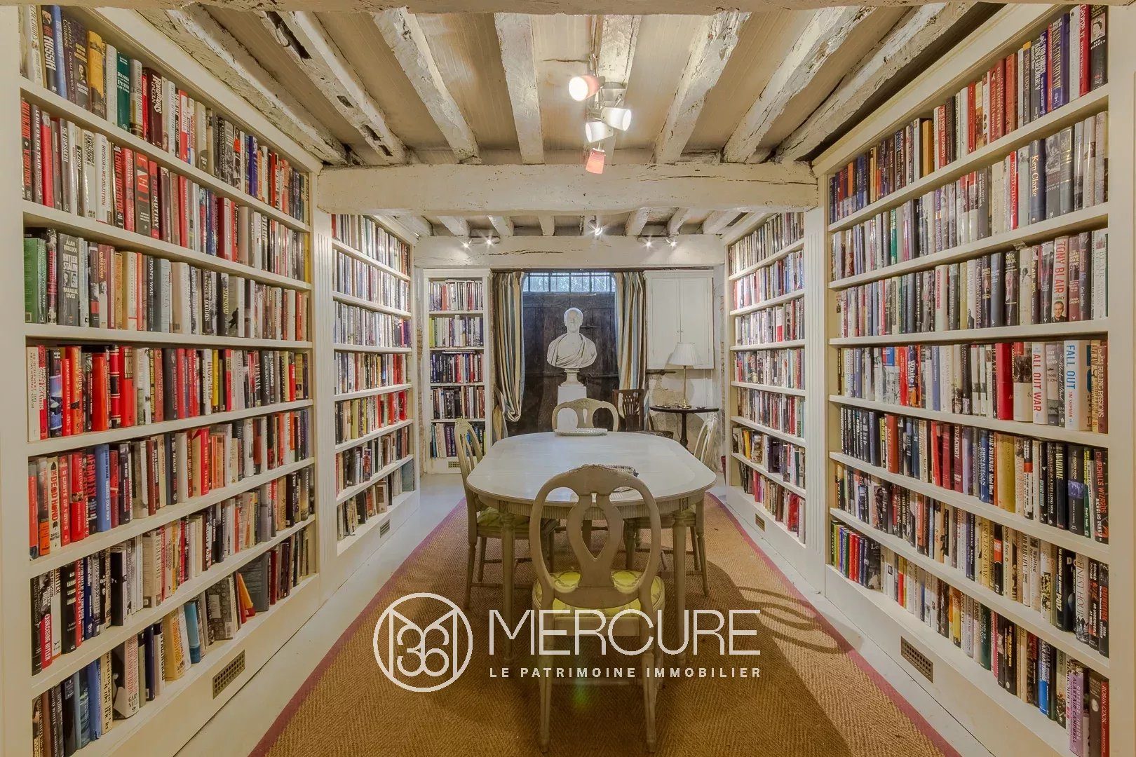 L’étage du bas : entrée, bibliothèque, cuisine donnant sur une terrasse, bureau, 2 chambres avec salle d’eau, buanderie, cellier et atelier.