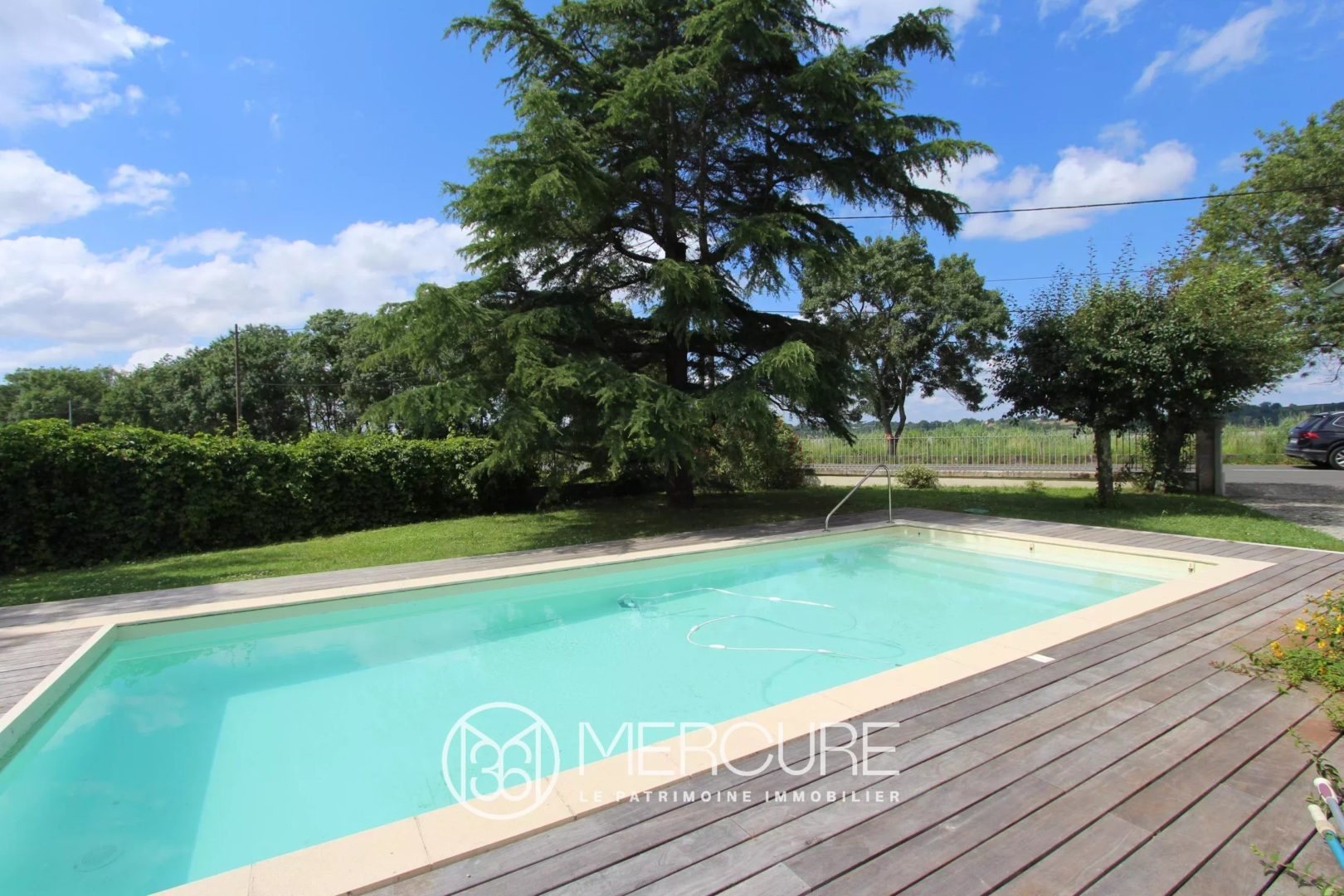 – un jardin clos de 996 m² comprenant un garage de 27 m² prolongé d’un abri à bois et une piscine avec terrasse en tek.