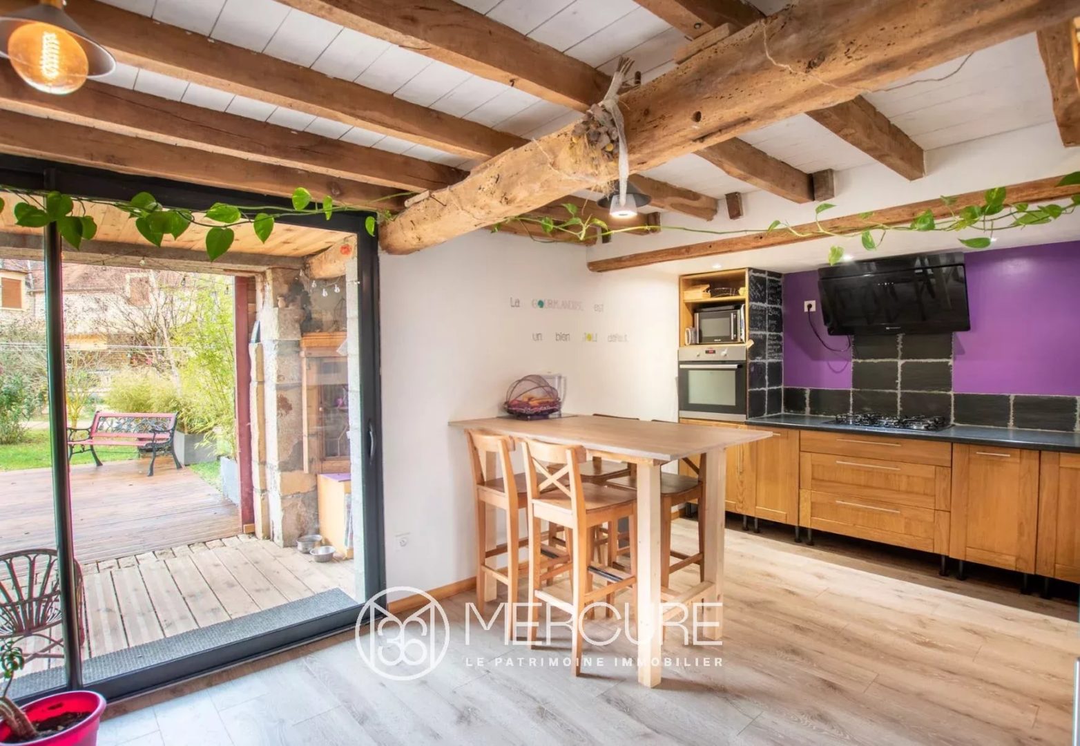 L’entrée ouvre sur un large salon-salle-à-manger avec un bar en pierre. Quelques marches en pierre également descendent vers la cuisine qui s’ouvre sur la terrasse par des baies vitrées. Au 1er étage : large chambre avec dressing et 3 autres chambres. Une grange attenante de 75m² au sol avec étage, offre la possibilité d’agrandir la maison. Climatisation réversible dans les chambres, poêle à bois.